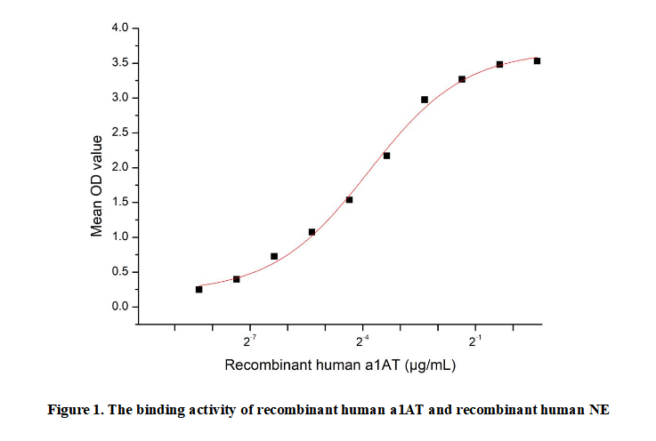 Alpha-1-Antitrypsin (a1AT), a major serine protease inhibitor synthesized primarily in the liver, is crucial for protecting tissues from excessive proteolytic damage. Circulating in human plasma, it targets and inhibits a range of proteases—including neutrophil elastase, trypsin, and chymotrypsin—which, if left unregulated, can degrade essential structural proteins. Beyond its protective function, A1AT is involved in modulating inflammatory responses and maintaining pulmonary homeostasis; deficiencies in A1AT are associated with conditions such as emphysema and liver disorders.Notably, a1AT directly binds to Neutrophil Elastase (NE), a potent protease released by activated neutrophils, irreversibly inhibiting NE’s tissue-damaging activity.To detect the activity of recombinant a1AT , a functional ELISA assay was performed to evaluate the interaction between recombinant human a1AT and recombinant human NE.Briefly, a1AT was diluted serially in PBS with 0.01% BSA (pH 7.4). Duplicate samples of 100 μl were then transferred to NE-coated microtiter wells and incubated for 1h at 37℃. Wells were washed with PBST and incubated for 1h with anti-a1AT pAb, then aspirated and washed 3 times. After incubation with HRP labelled secondary antibody for 1h at 37℃, wells were aspirated and washed 5 times. With the addition of substrate solution, wells were incubated 15-25 minutes at 37℃. Finally, add 50 µL stop solution to the wells and read at 450/630nm immediately. The binding activity of recombinant human a1AT and recombinant human NE was shown in Figure 1, the EC50 for this effect is 0.07 µg/mL.