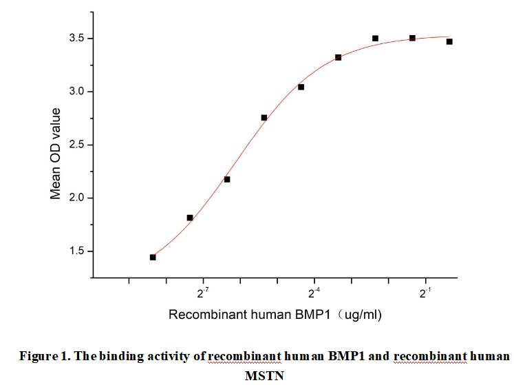 Bone Morphogenetic Protein 1 (BMP1) is a metalloprotease that plays a crucial role in extracellular matrix (ECM) remodeling and tissue development. It processes procollagens and other ECM precursors, contributing to bone formation, wound healing, and organogenesis. Unlike other BMP family members, BMP1 lacks osteoinductive activity but is essential for activating TGF-β superfamily proteins, including growth factors involved in skeletal and connective tissue regulation. BMP1 cleaves and inactivates Myostatin (MSTN), a negative regulator of muscle growth, thereby indirectly promoting muscle hypertrophy by reducing MSTN-mediated inhibition of myogenesis.Thus a functional ELISA assay was conducted to detect the interaction of recombinant human BMP1 and recombinant human MSTN. Briefly, BMP1 was diluted serially in PBS with 0.01% BSA (pH 7.4). Duplicate samples of 100 μl were then transferred to MSTN-coated microtiter wells and incubated for 1h at 37℃. Wells were washed with PBST and incubated for 1h with anti-BMP1 pAb, then aspirated and washed 3 times. After incubation with HRP labelled secondary antibody for 1h at 37℃, wells were aspirated and washed 5 times. With the addition of substrate solution, wells were incubated 15-25 minutes at 37℃. Finally, add 50 µL stop solution to the wells and read at 450/630nm immediately. The binding activity of recombinant human BMP1 and recombinant human MSTN was shown in Figure 1, the EC50 for this effect is 0.014 μg/mL.