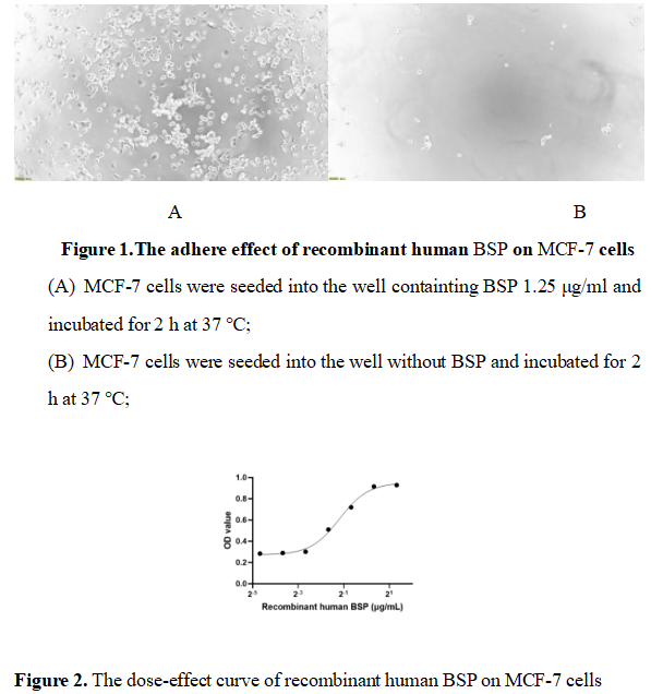 Bone Sialoprotein (BSP) is a highly glycosylated and phosphorylated non-collagenous protein that plays a pivotal role in mineralized tissues, particularly in bone and dentin. As a member of the small integrin-binding ligand N-linked glycoprotein (SIBLING) family, it is primarily synthesized by osteoblasts, odontoblasts, and chondrocytes, and is prominently localized in the extracellular matrix of mineralizing tissues. Additionally, it also has the function of cell adhesion. Therefore, we measure the activity of recombinant human BSP by the ability of the immobilized protein to support the adhesion of MCF-7 cell. When 5 x 104 cells/well are added to different concentrations of recombinant human BSP coated plates, cells will adhere after 2 hour incubation at 37 ℃. The adhesion of MCF-7 after 2 hour incubation at 37 ℃ observed by inverted microscope was shown in Figure 1. Cell adherent was in a dose dependent manner, the result was shown in Figure 2, the EC50 was 0.44 μg/ml.