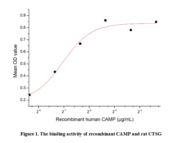 CAMP encodes Cathelicidin Antimicrobial Peptide, a key component of the innate immune system. Expressed in epithelial cells and immune cells, it exhibits broad-spectrum antimicrobial activity against bacteria, fungi, and viruses. Beyond pathogen elimination, it regulates inflammation and promotes wound healing, playing vital roles in host defense. CAMP binds with CTSG to enhance antimicrobial efficacy and modulate immune response synergistically.Thus a functional ELISA assay was conducted to detect the interaction of recombinant human CAMP and recombinant rat CTSG. Briefly, CAMP was diluted serially in PBS with 0.01% BSA (pH 7.4). Duplicate samples of 100 μl were then transferred to CTSG-coated microtiter wells and incubated for 1h at 37℃. Wells were washed with PBST and incubated for 1h with anti-CAMP pAb, then aspirated and washed 3 times. After incubation with HRP labelled secondary antibody for 1h at 37℃, wells were aspirated and washed 5 times. With the addition of substrate solution, wells were incubated 15-25 minutes at 37℃. Finally, add 50 µL stop solution to the wells and read at 450/630nm immediately. The binding activity of recombinant human CAMP and recombinant rat CTSG was shown in Figure 1, the EC50 for this effect is 0.0076µg/mL.