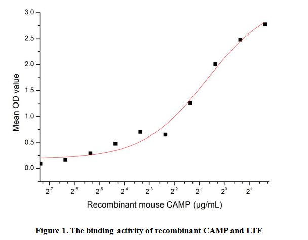Cathelicidin Antimicrobial Peptide (CAMP) is a cationic host defense peptide predominantly expressed in neutrophils, epithelial cells, and keratinocytes, with a conserved cathelin domain at the N-terminus and a variable antimicrobial domain at the C-terminus. It exerts broad-spectrum antimicrobial activity against bacteria, fungi, and viruses by disrupting microbial cell membranes, and also modulates the host immune response by regulating cytokine secretion, promoting immune cell recruitment, and enhancing wound healing. CAMP plays a critical role in innate immunity, bridging the gap between innate and adaptive immune systems. Abnormal CAMP expression is associated with inflammatory disorders, skin diseases, and infectious pathologies, making it a promising target for developing antimicrobial therapeutics. CAMP interacts with lactoferrin (LTF) to synergistically enhance antimicrobial efficacy and immune regulatory functions.Thus a functional ELISA assay was conducted to detect the interaction of recombinant mouse CAMP and recombinant human LTF. Briefly, CAMP was diluted serially in PBS with 0.01% BSA (pH 7.4). Duplicate samples of 100 μl were then transferred to LTF-coated microtiter wells and incubated for 1h at 37℃. Wells were washed with PBST and incubated for 1h with anti-CAMP pAb, then aspirated and washed 3 times. After incubation with HRP labelled secondary antibody for 1h at 37℃, wells were aspirated and washed 5 times. With the addition of substrate solution, wells were incubated 15-25 minutes at 37℃. Finally, add 50 µL stop solution to the wells and read at 450/630nm immediately. The binding activity of recombinant mouse CAMP and recombinant human LTF was shown in Figure 1, the EC50 for this effect is 0.612µg/mL.