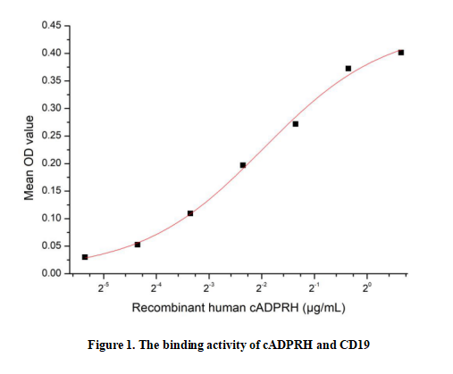 Cyclic ADP Ribose Hydrolase (cADPRH), commonly known as CD38, is a multifunctional enzyme widely expressed on various cell surfaces. Its primary function involves catalyzing the synthesis and hydrolysis of cyclic ADP-ribose (cADPR) from NAD⁺. cADPR is a crucial secondary messenger that mobilizes calcium ions from intracellular stores, thereby playing a vital role in regulating calcium signaling. This process is essential for numerous physiological functions, including immune response, insulin secretion, and neural signaling. CD38's involvement in calcium homeostasis links it to metabolic diseases, aging, and immune disorders. Furthermore, it serves as a cell surface marker in hematological malignancies and is a target for therapeutic antibodies.Besides,CD19 has been identified as an interactor of cADPRH, thus a functional binding ELISA assay was conducted to detect the interaction of recombinant human cADPRH and recombinant human CD19. Briefly, biotin-linked cADPRH were diluted serially in PBS, with 0.01% BSA (pH 7.4). Duplicate samples of 100µl were then transferred to CD19-coated microtiter wells and incubated for 1h at 37℃. Wells were washed with PBST 3 times and incubation with Streptavidin-HRP for 30min, then wells were aspirated and washed 5 times. With the addition of substrate solution, wells were incubated 15-25 minutes at 37℃. Finally, add 50µl stop solution to the wells and read at 450nm immediately. The binding activity of cADPRH and CD19 was shown in Figure 1, the EC50 for this effect is 0.25497µg/mL.