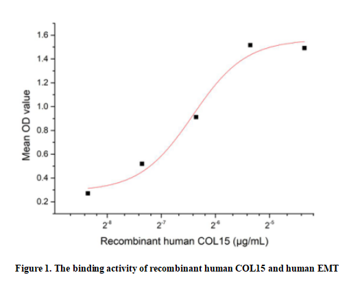 Collagen Type XV (COL15, encoded by COL15A1) is a non-fibrillar FACIT collagen, widely distributed in human tissues and highly enriched in basement membrane zones. It forms a homotrimeric structure with interrupted collagenous domains, functioning to anchor basement membranes to underlying connective tissue stroma and stabilize tissue architecture. Its C-terminal fragment, restin, exhibits anti-angiogenic activity. COL15 acts as a tumor suppressor; its loss correlates with muscle/microvessel degeneration and enhanced cancer cell invasion. Hypoxia upregulates COL15 via HIF-1α, and it modulates epithelial-mesenchymal transition (EMT) in tumor microenvironments. COL15 indirectly interacts with E-cadherin by regulating EMT signaling, thereby stabilizing E-cadherin-mediated cell-cell adhesion.Thus a functional ELISA assay was conducted to detect the interaction of recombinant human COL15 and recombinant human EMT. Briefly, COL15 was diluted serially in PBS with 0.01% BSA (pH 7.4). Duplicate samples of 100 μl were then transferred to EMT-coated microtiter wells and incubated for 1h at 37℃. Wells were washed with PBST and incubated for 1h with anti-COL15 pAb, then aspirated and washed 3 times. After incubation with HRP labelled secondary antibody for 1h at 37℃, wells were aspirated and washed 5 times. With the addition of substrate solution, wells were incubated 15-25 minutes at 37℃. Finally, add 50 µL stop solution to the wells and read at 450/630nm immediately. The binding activity of recombinant human COL15 and recombinant human EMT was shown in Figure 1, the EC50 for this effect is 0.0117 µg/mL.