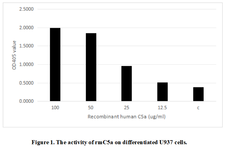 Complement Component 5a (C5a) is a component of the complement system which plays a key role in promoting migration and adherence of neutrophils and monocytes to vessel walls. The activity of recombinant human C5a was also measured by its ability to induce N-acetyl-β-D-glucosaminidase release from differentiated U937 human histiocytic lymphoma cells. 3.2*106 differentiated U937 cells were added to the 24-well plate and different concentrations of rmC5a was added to the 24-well plate and incubated at 37 ℃ for 3min. The cells were centrifuged at 400 g for 3min, and the supernatant contained N-acetyl-β-D-glucosaminidase. The enzyme activity of N-acetyl-β-D-glucosaminidase was measured by the substrate of 4-Nitrophenyl 2-acetamido-2-deoxy-β-D-glucopyranoside. The result was shown in figure 1, It was obvious that rmC5a can significantly induce N-acetyl-β-D-glucosaminidase release.