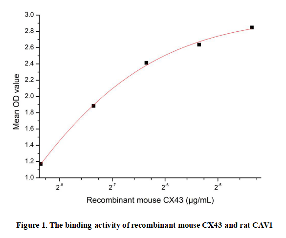 Connexin 43 (CX43), encoded by the GJA1 gene, is the most ubiquitously expressed member of the connexin family, a class of transmembrane proteins critical for gap junction intercellular communication (GJIC). Primarily localized at the plasma membrane, CX43 assembles into hexameric hemichannels; docking of hemichannels between adjacent cells forms gap junction channels, which permit the passage of small molecules (e.g., ions, metabolites, second messengers) and facilitate synchronized cellular activities. Beyond GJIC, CX43 hemichannels also function independently to mediate paracrine signaling by releasing signaling molecules (e.g., ATP) into the extracellular space. CX43 is widely distributed in cardiac tissue, smooth muscle, epithelial cells, and the central nervous system, and its dysregulation is linked to various pathological conditions, including cardiac arrhythmias, cancer metastasis, and neurodegenerative disorders. Moreover, CX43 physically interacts with Caveolin-1 (CAV1) at the plasma membrane, which modulates CX43 trafficking, channel gating, and degradation to fine-tune intercellular communication efficiency. Briefly,rat CAV1 was diluted serially in PBS with 0.01% BSA (pH 7.4). Duplicate samples of 100 μl were then transferred to CX43-coated microtiter wells and incubated for 1h at 37℃. Wells were washed with PBST and incubated for 1h with anti-CAV1 pAb, then aspirated and washed 3 times. After incubation with HRP labelled secondary antibody for 1h at 37℃, wells were aspirated and washed 5 times. With the addition of substrate solution, wells were incubated 15-25 minutes at 37℃. Finally, add 50 µL stop solution to the wells and read at 450/630nm immediately. Measured by its binding ability in a functional ELISA. When Recombinant mouse CX43 is lmmobilized at 2 µg/mL(100 uLwell), the concentration of rat CAV1 that produces 50% optimal bindingresponse is found to be approximately 0.0015 µg/mL.