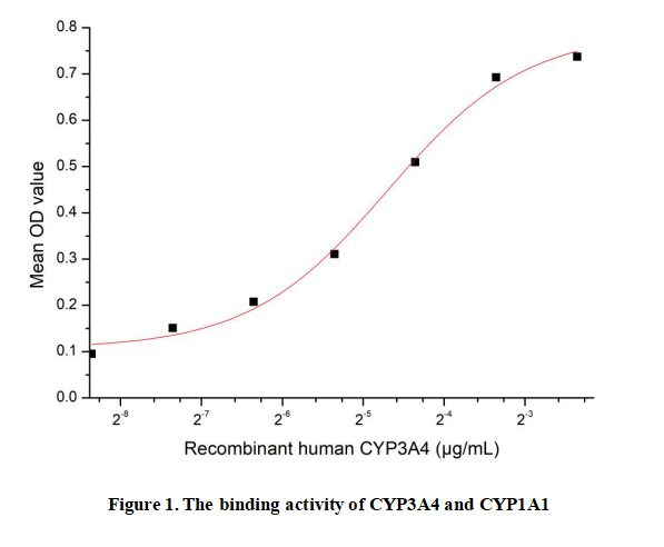 Cytochrome P450 3A4 (CYP3A4), a member of the cytochrome P450 superfamily of heme - containing enzymes, is predominantly expressed in the human liver and small intestine, serving as a key player in xenobiotic metabolism and endobiotic biotransformation. It catalyzes the oxidation of over 50% of clinically used drugs, including statins, immunosuppressants, and anticancer agents, by adding oxygen atoms to hydrophobic substrates, thereby facilitating their excretion. CYP3A4 expression and activity are highly variable among individuals due to genetic polymorphisms, environmental inducers (e.g., rifampicin, phenobarbital) and inhibitors (e.g., ketoconazole, grapefruit juice). Beyond drug metabolism, it participates in the breakdown of endogenous compounds such as steroids and bile acids, maintaining physiological homeostasis. Notably, CYP3A4 and CYP1A1, both phase I metabolic enzymes, exhibit potential functional binding to synergistically modulate the metabolism of shared substrates, with their interaction being a critical part of the hepatic metabolic network.To detect the activity of recombinant CYP3A4, a functional ELISA assay was performed to evaluate the interaction between recombinant human CYP3A4 and recombinant human CYP1A1.Briefly, biotin-linked CYP3A4 were diluted serially in PBS, with 0.01% BSA (pH 7.4). Duplicate samples of 100µl were then transferred to CYP1A1-coated microtiter wells and incubated for 1h at 37℃. Wells were washed with PBST 3 times and incubation with Streptavidin-HRP for 30min, then wells were aspirated and washed 5 times. With the addition of substrate solution, wells were incubated 15-25 minutes at 37℃. Finally, add 50µl stop solution to the wells and read at 450nm immediately. The binding activity of CYP3A4 and CYP1A1 was shown in Figure 1, the EC50 for this effect is 0.03849µg/mL..
