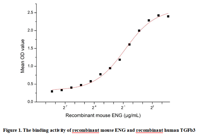 Endoglin (ENG) is a transmembrane glycoprotein that serves as a co-receptor for transforming growth factor-beta (TGF-b) superfamily ligands, particularly TGFb3 and TGFb3. Primarily expressed on vascular endothelial cells, ENG plays pivotal roles in angiogenesis, vascular remodeling, and maintaining vascular integrity. It modulates TGF-b signaling by forming complexes with type I and II TGF-b receptors, influencing both SMAD-dependent and non-SMAD pathways. ENG exists as two isoforms (long and short) generated by alternative splicing, with differential signaling capabilities. Its critical involvement in cardiovascular development is evidenced by ENG mutations causing hereditary hemorrhagic telangiectasia (HHT), a vascular dysplasia disorder. Beyond vasculature, ENG participates in inflammation, wound healing, and cancer progression, where its expression often correlates with tumor angiogenesis and metastasis. The soluble form (sENG) has emerged as a potential biomarker for preeclampsia and cardiovascular diseases.To detect the activity of recombinant ENG, a functional ELISA assay was performed to evaluate the interaction between recombinant mouse ENG and recombinant human TGFb3.Briefly, biotin-linked ENG were diluted serially in PBS, with 0.01% BSA (pH 7.4). Duplicate samples of 100μl were then transferred to TGFb3-coated microtiter wells and incubated for 1h at 37℃. Wells were washed with PBST 3 times and incubation with Streptavidin-HRP for 30min, then wells were aspirated and washed 5 times. With the addition of substrate solution, wells were incubated 15-25 minutes at 37℃. Finally, add 50µl stop solution to the wells and read at 450nm immediately. The binding activity of ENG and TGFb3 was shown in Figure 1, the EC50 for this effect is 0.56 µg/mL.