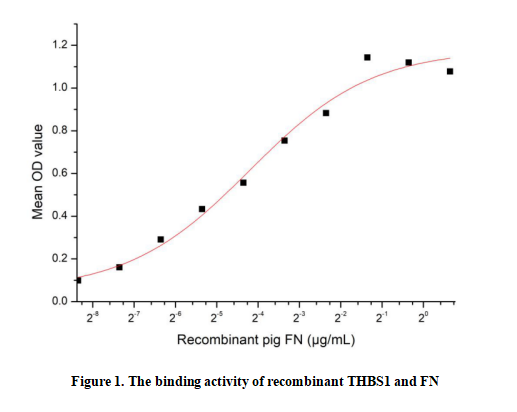 Fibronectin (FN), a large, modular glycoprotein encoded by the FN1 gene, is a key component of the extracellular matrix (ECM) and plasma. Synthesized primarily by fibroblasts, hepatocytes, and endothelial cells, it exists in two major forms: soluble plasma FN and insoluble cellular FN. FN mediates critical cellular processes via its integrin-binding RGD motif, including cell adhesion, migration, proliferation, and differentiation. It also participates in ECM assembly, wound healing, and angiogenesis by bridging cells to other ECM components like collagen, fibrin, and proteoglycans. Dysregulated FN expression or function is linked to pathological conditions such as fibrosis, cancer metastasis, and cardiovascular diseases, making it a vital target for biomedical research. FN binds THBS1, a secreted glycoprotein, to modulate ECM stability and regulate cellular adhesion signaling pathways.Briefly, THBS1 was diluted serially in PBS with 0.01% BSA (pH 7.4). Duplicate samples of 100 μl were then transferred to FN-coated microtiter wells and incubated for 1h at 37℃. Wells were washed with PBST and incubated for 1h with anti-THBS1 pAb, then aspirated and washed 3 times. After incubation with HRP labelled secondary antibody for 1h at 37℃, wells were aspirated and washed 5 times. With the addition of substrate solution, wells were incubated 15-25 minutes at 37℃. Finally, add 50 µL stop solution to the wells and read at 450/630nm immediately.Measured by its binding ability in a functional ELISA. When Recombinant FN is immobilized at 2 µg/mL(100 uLwell), the concentration of THBS1 that produces 50% optimal binding response is found to be approximately 0.054 µg/mL.
