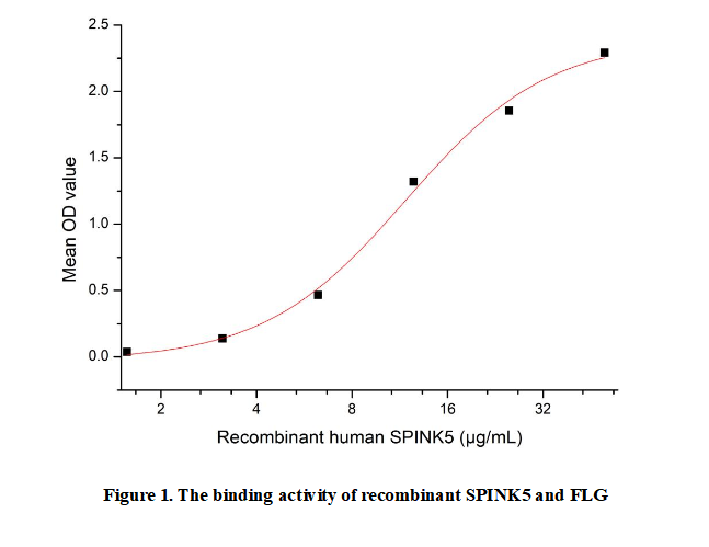 Filaggrin (FLG), a key keratinocyte differentiation protein encoded by the FLG gene, is critical for skin barrier formation. Synthesized as a large precursor, profilaggrin, it is cleaved into functional filaggrin monomers in the stratum granulosum of the epidermis. These monomers bind to keratin filaments, promoting their aggregation to form a dense, protective cytoskeletal structure. Filaggrin also contributes to skin hydration by breaking down into natural moisturizing factors. FLG interacts with SPINK5, which encodes the serine protease inhibitor LEKTI; SPINK5 regulates proteases that process profilaggrin into filaggrin, maintaining proper barrier function.Briefly, SPINK5 was diluted serially in PBS with 0.01% BSA (pH 7.4). Duplicate samples of 100 μl were then transferred to FLG-coated microtiter wells and incubated for 1h at 37℃. Wells were washed with PBST and incubated for 1h with anti-SPINK5 pAb, then aspirated and washed 3 times. After incubation with HRP labelled secondary antibody for 1h at 37℃, wells were aspirated and washed 5 times. With the addition of substrate solution, wells were incubated 15-25 minutes at 37℃. Finally, add 50 µL stop solution to the wells and read at 450/630nm immediately.Measured by its binding ability in a functional ELISA. When Recombinant FLG is lmmobilized at 2 µg/mL(100 uLwell), the concentration of SPINK5 that produces 50% optimal bindingresponse is found to be approximately11.830 µg/mL.