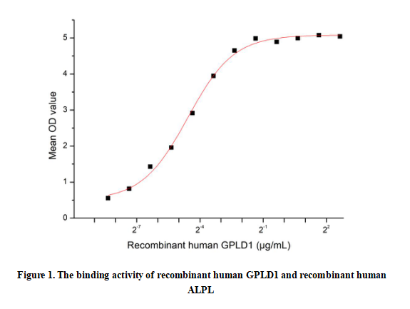 Glycosylphosphatidylinositol Specific Phospholipase D1 (GPLD1) is a secreted enzyme that cleaves glycosylphosphatidylinositol (GPI) anchors, releasing GPI-anchored proteins from cell membranes into circulation. Primarily synthesized in the liver, it plays key roles in lipid metabolism, inflammation, and neurogenesis. GPLD1's activity modulates the bioavailability of important GPI-anchored proteins like alkaline phosphatase and folate receptors. Studies link elevated GPLD1 levels to metabolic disorders and aging-related cognitive decline, while its neuroprotective effects are being investigated. The enzyme's structure contains catalytic domains essential for hydrolyzing GPI linkages, making it a potential therapeutic target for metabolic and neurological diseases.Besides,Alkaline Phosphatase, Tissue-nonspecific (ALPL) has been identified as an interactor of GPLD1, thus a functional binding ELISA assay was conducted to detect the interaction of recombinant human GPLD1 and recombinant human ALPL. Briefly, GPLD1 was diluted serially in PBS with 0.01% BSA (pH 7.4). Duplicate samples of 100 μl were then transferred to ALPL-coated microtiter wells and incubated for 1h at 37℃. Wells were washed with PBST and incubated for 1h with anti-GPLD1 pAb, then aspirated and washed 3 times. After incubation with HRP labelled secondary antibody for 1h at 37℃, wells were aspirated and washed 5 times. With the addition of substrate solution, wells were incubated 15-25 minutes at 37℃. Finally, add 50 µL stop solution to the wells and read at 450/630nm immediately. The binding activity of recombinant human GPLD1 and recombinant human ALPL was shown in Figure 1, the EC50 for this effect is 0.042µg/mL.