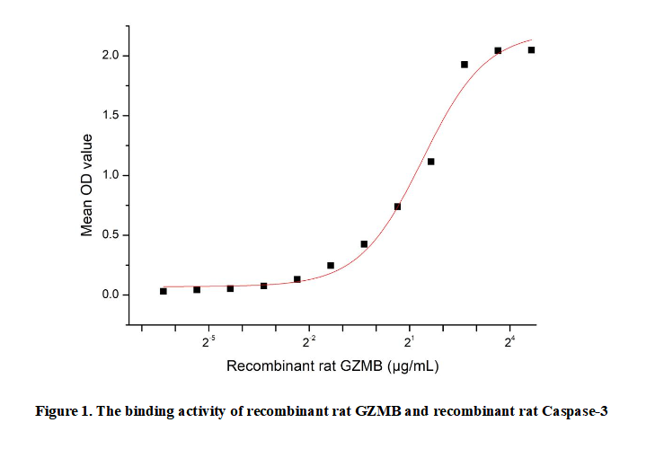 Granzyme B (GZMB) is a serine protease predominantly secreted by cytotoxic T lymphocytes (CTLs) and natural killer (NK) cells. It serves as a central effector molecule in the granule exocytosis pathway, which is essential for cell-mediated elimination of virus-infected and malignant cells. Upon target cell recognition, CTLs and NK cells release GZMB together with perforin. Perforin facilitates the entry of GZMB into the target cell by forming pores in the membrane, where GZMB then initiates apoptotic signaling. In addition to its well-established role in apoptosis, GZMB also contributes to immune regulation and tissue remodeling through involvement in inflammatory responses and extracellular matrix degradation. Besides,Caspase-3 has been identified as an interactor of GZMB, thus a functional binding ELISA assay was conducted to detect the interaction of recombinant rat GZMB and recombinant rat Caspase-3 .Briefly, biotin-linked GZMB were diluted serially in PBS, with 0.01% BSA (pH 7.4). Duplicate samples of 100µl were then transferred to Caspase-3-coated microtiter wells and incubated for 1h at 37℃. Wells were washed with PBST 3 times and incubation with Streptavidin-HRP for 30min, then wells were aspirated and washed 5 times. With the addition of substrate solution, wells were incubated 15-25 minutes at 37℃. Finally, add 50µl stop solution to the wells and read at 450nm immediately. The binding activity of GZMB and Caspase-3 was shown in Figure 1, the EC50 for this effect is 2.62µg/mL.
