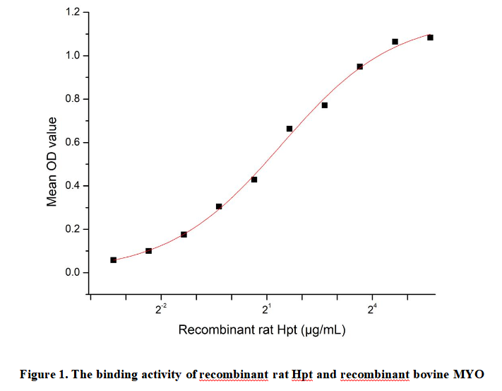 Haptoglobin (Hpt) is an acute-phase plasma glycoprotein primarily produced by hepatocytes. It serves crucial roles in iron homeostasis and antioxidant defense by binding free hemoglobin (Hb) released during hemolysis, forming an irreversible Hpt-Hb complex. This complex is rapidly cleared via macrophage CD163 receptors, preventing Hb-induced oxidative tissue damage and iron loss. As a sensitive acute-phase reactant, Hpt levels elevate markedly during inflammation, infection, or tissue injury, making it a valuable clinical marker. Notably, Hpt can also bind myoglobin (MYO) - though with lower affinity than Hb - potentially alleviating MYO-mediated oxidative stress in rhabdomyolysis or muscle injury.Thus a functional binding ELISA assay was conducted to detect the interaction of recombinant rat Hpt and recombinant bovine MYO . Briefly, biotin-linked Hpt were diluted serially in PBS, with 0.01% BSA (pH 7.4). Duplicate samples of 100μl were then transferred to MYO-coated microtiter wells and incubated for 1h at 37℃. Wells were washed with PBST 3 times and incubation with Streptavidin-HRP for 30min, then wells were aspirated and washed 5 times. With the addition of substrate solution, wells were incubated 15-25 minutes at 37℃. Finally, add 50µl stop solution to the wells and read at 450nm immediately. The binding activity of recombinant rat Hpt and recombinant bovine MYO was shown in Figure 1, the EC50 for this effect is 0.57 µg/mL.