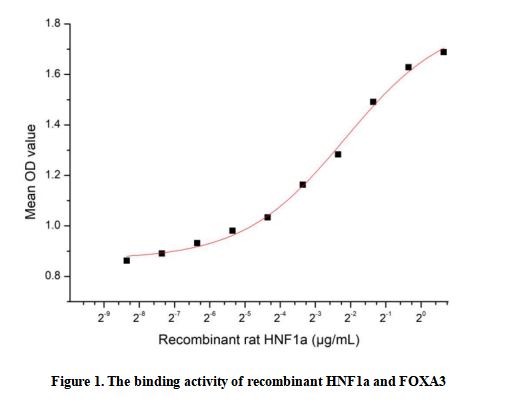 Hepatocyte Nuclear Factor 1 Alpha (HNF1a), encoded by the HNF1A gene, is a key transcription factor predominantly expressed in the liver, pancreas, and kidney. It regulates the expression of numerous genes involved in glucose and lipid metabolism, epithelial cell differentiation, and organ homeostasis. Mutations in HNF1A are closely linked to maturity-onset diabetes of the young type 3 (MODY3), a monogenic form of diabetes. HNF1a interacts with FOXA3, a pioneer transcription factor, to synergistically enhance the transcription of target genes related to metabolic processes.Thus a functional ELISA assay was conducted to detect the interaction of recombinant rat HNF1a and recombinant human FOXA3. Briefly, HNF1a was diluted serially in PBS with 0.01% BSA (pH 7.4). Duplicate samples of 100 μl were then transferred to FOXA3-coated microtiter wells and incubated for 1h at 37℃. Wells were washed with PBST and incubated for 1h with anti-HNF1a pAb, then aspirated and washed 3 times. After incubation with HRP labelled secondary antibody for 1h at 37℃, wells were aspirated and washed 5 times. With the addition of substrate solution, wells were incubated 15-25 minutes at 37℃. Finally, add 50 µL stop solution to the wells and read at 450/630nm immediately. The binding activity of recombinant rat HNF1a and recombinant human FOXA3 was shown in Figure 1, the EC50 for this effect is 0.2245µg/mL.