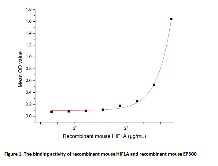 Hypoxia-inducible factor 1-alpha (HIF1A) is a key transcription factor that orchestrates cellular responses to hypoxia. Under normal oxygen conditions, it undergoes rapid proteasomal degradation mediated by the von Hippel-Lindau (VHL) ubiquitination pathway. In hypoxia, however, HIF1A stabilizes and translocates to the nucleus, where it forms a heterodimer with HIF1β and binds to hypoxia-response elements (HREs), activating genes involved in angiogenesis, glycolysis, and erythropoiesis. Its dysregulation is implicated in cancer, ischemic disorders, and metabolic diseases, highlighting its importance as a therapeutic target. Notably, HIF1A directly interacts with E1A Binding Protein P300 (EP300) through its C-terminal transactivation domain, recruiting this coactivator to enhance histone acetylation and drive robust expression of hypoxia-inducible genes.To detect the activity of recombinant HIF1A , a functional ELISA assay was performed to evaluate the interaction between recombinant mouse HIF1A and recombinant mouse EP300. Briefly, HIF1A were diluted serially in PBS, with 0.01% BSA (pH 7.4). Duplicate samples of 100ul were then transferred to EP300-coated microtiter wells and incubated for 2h at 37℃. Wells were washed with PBST and incubated for 1h with anti-HIF1A pAb, then aspirated and washed 3 times. After incubation with HRP labelled secondary antibody, wells were aspirated and washed 3 times. With the addition of substrate solution , wells were incubated 15-25 minutes at 37℃. Finally, add 50µL stop solution to the wells and read at 450nm immediately. The binding activity of HIF1A and EP300 was shown in Figure 1, and this effect was in a dose dependent manner.