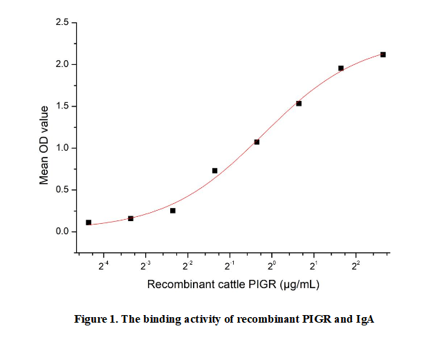 Immunoglobulin A (IgA), the most abundant antibody in human mucosal secretions, plays a pivotal role in mucosal immunity. It exists mainly as dimers linked by the J chain, forming secretory IgA (sIgA) when combined with the secretory component (SC). Synthesized by plasma cells in mucosal tissues, IgA defends against pathogens by blocking adhesion and neutralizing toxins at mucosal surfaces. IgA binds to the Polymeric Immunoglobulin Receptor (PIGR), which mediates its transcytosis across epithelial cells to mucosal surfaces.Briefly, PIGR was diluted serially in PBS with 0.01% BSA (pH 7.4). Duplicate samples of 100 μl were then transferred to IgA-coated microtiter wells and incubated for 1h at 37℃. Wells were washed with PBST and incubated for 1h with anti-PIGR pAb, then aspirated and washed 3 times. After incubation with HRP labelled secondary antibody for 1h at 37℃, wells were aspirated and washed 5 times. With the addition of substrate solution, wells were incubated 15-25 minutes at 37℃. Finally, add 50 µL stop solution to the wells and read at 450/630nm immediately.Measured by its binding ability in a functional ELISA. When Recombinant IgA is lmmobilized at 2 µg/mL(100 uLwell), the concentration of PIGR that produces 50% optimal bindingresponse is found to be approximately 0.86627 µg/mL.