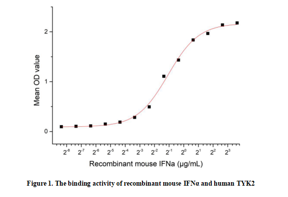 Interferon Alpha (IFNα, encoded by IFNA gene family) is a type I interferon with potent antiviral, antiproliferative, and immunomodulatory activities. It is primarily secreted by plasmacytoid dendritic cells, lymphocytes, and other host cells in response to viral infection, double-stranded RNA, and various pathogen-associated molecular patterns. Upon binding to its cell surface receptor complex IFNAR1/IFNAR2, IFNα initiates intracellular signaling cascades that induce the expression of hundreds of interferon-stimulated genes (ISGs), which inhibit viral replication, modulate immune cell function, and suppress tumor cell growth. Clinically, recombinant IFNα is widely used in the treatment of viral hepatitis, certain hematological malignancies, and some solid tumors. Dysregulation of IFNα signaling is linked to autoimmune diseases and chronic inflammatory disorders. IFNα binding triggers receptor dimerization and recruits TYK2, which mediates downstream JAK-STAT phosphorylation and signaling activation. Thus a functional ELISA assay was conducted to detect the interaction of recombinant mouse IFNα and recombinant human TYK2. Briefly, IFNα was diluted serially in PBS with 0.01% BSA (pH 7.4). Duplicate samples of 100 μL were then transferred to TYK2-coated microtiter wells and incubated for 1h at 37℃. Wells were washed with PBST and incubated for 1h with anti-IFNα pAb, then aspirated and washed 3 times. After incubation with HRP labelled secondary antibody for 1h at 37℃, wells were aspirated and washed 5 times. With the addition of substrate solution, wells were incubated 15-25 minutes at 37℃. Finally, add 50 µL stop solution to the wells and read at 450/630nm immediately. The binding activity of recombinant mouse IFNα and recombinant human TYK2 was shown in Figure 1, the EC50 for this effect is 0.473 µg/mL.