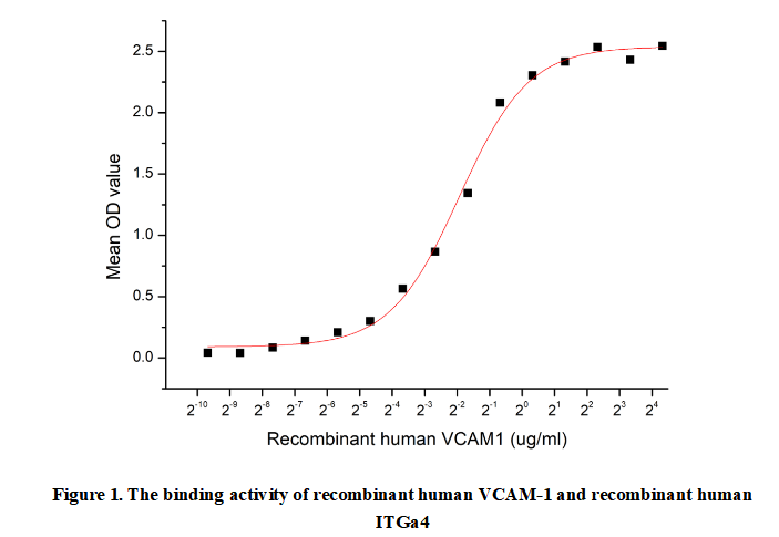 Vascular cell adhesion protein 1 (VCAM-1) is a cell adhesion molecule and a member of the immunoglobulin superfamily. Alternatively spliced forms are known to occur, but the most common form is a type I transmembrane protein with a 674 amino acid extracellular segment that includes seven C2-type immunoglobulin domains. VCAM-1 is expressed by activated endothelial cells and certain other cell types including macrophages, dendritic cells, neurons, smooth muscle cells, fibroblasts, and oocytes. Besides, Integrin Alpha 4 (ITGa4) has been identified as an interactor of VCAM-1, thus a binding ELISA assay was conducted to detect the interaction of recombinant human VCAM-1 and recombinant human ITGa4. Briefly, biotin-linked VCAM-1 were diluted serially in PBS, with 0.01% BSA (pH 7.4). Duplicate samples of 100 μl were then transferred to ITGa4-coated microtiter wells and incubated for 1h at 37℃. Wells were washed with PBST 3 times and incubation with Streptavidin-HRP for 30min, then wells were aspirated and washed 5 times. With the addition of substrate solution, wells were incubated 15-25 minutes at 37℃. Finally, add 50 µl stop solution to the wells and read at 450nm immediately. The binding activity of recombinant human VCAM-1 and recombinant human ITGa4 was shown in Figure 1, the EC50 for this effect is 0.261 ug/mL.