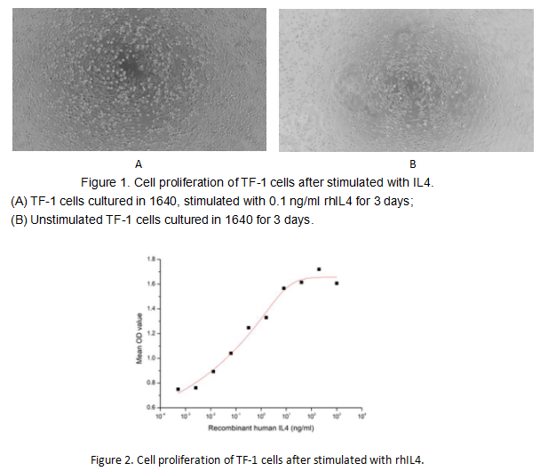 The interleukin 4 (IL4,) is a cytokine that induces differentiation of naive helper T cells (Th0 cells) to Th2 cells. Upon activation by IL4, Th2 cells subsequently produce additional IL4 in a positive feedback loop. IL4 has many biological roles, including the stimulation of activated B-cell and T-cell proliferation, and the differentiation of B cells into plasma cells. It is a key regulator in humoral and adaptive immunity. IL4 induces B-cell class switching to IgE, and up-regulates MHC class II production. IL4 decreases the production of Th1 cells, macrophages, IFN-gamma, and dendritic cell IL12. The activity of IL4 is usually measured by a cell proliferation assay using TF-1 cells. TF-1 cells were seeded into triplicate wells of 96-well plates at a density of 20000 cells/well with 10% serum standard 1640 which contains various concentrations of recombinant human IL4. After incubated for 3 days, cells were observed by inverted microscope and cell proliferation was measured by Cell Counting Kit-8 (CCK-8). Briefly, 10 µl of CCK-8 solution was added to each well of the plate, then the absorbance at 450 nm was measured using a microplate reader after incubating the plate for 2-4 hours at 37 ℃. Proliferation of TF-1 cells after incubation with IL4 for 3 days observed by inverted microscope was shown in Figure 1. Cell viability was assessed by CCK-8 (Cell Counting Kit-8 ) assay after incubation with rhIL4 for 3 days. The result was shown in Figure 2. It was obvious that rhIL4 significantly increased cell viability of TF-1 cells. The ED50 is 0.03 ng/ml.