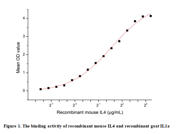 Interleukin 4 (IL4) is a pleiotropic cytokine primarily secreted by activated T cells, mast cells, and basophils. It plays a central role in immune regulation by promoting the differentiation of naïve T cells into Th2 cells and stimulating B cell proliferation and antibody class switching to IgE and IgG1. IL4 is crucial for defense against parasitic infections and is involved in allergic responses, including asthma and atopic dermatitis. It signals through the IL4 receptor complex , activating JAK-STAT pathways to modulate gene expression. Dysregulated IL4 production is associated with autoimmune diseases, chronic inflammation, and cancer. Its dual role in both promoting and suppressing immune responses makes it a key therapeutic target.Besides,Interleukin 1 Alpha (IL1a) has been identified as an interactor of IL4, thus a functional binding ELISA assay was conducted to detect the interaction of recombinant mouse IL4 and recombinant goat IL1a. Briefly, IL4 was diluted serially in PBS with 0.01% BSA (pH 7.4). Duplicate samples of 100 μl were then transferred to IL1a-coated microtiter wells and incubated for 1h at 37℃. Wells were washed with PBST and incubated for 1h with anti-IL4 pAb, then aspirated and washed 3 times. After incubation with HRP labelled secondary antibody for 1h at 37℃, wells were aspirated and washed 5 times. With the addition of substrate solution, wells were incubated 15-25 minutes at 37℃. Finally, add 50 µL stop solution to the wells and read at 450/630nm immediately. The binding activity of recombinant mouse IL4 and recombinant goat IL1a was shown in Figure 1, the EC50 for this effect is 1.595µg/mL.
