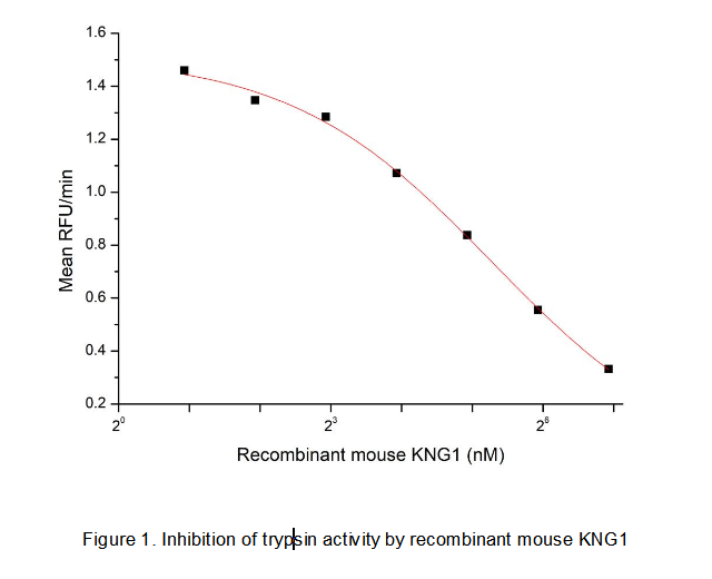 Kininogen 1 (KNG1), specifically its high-molecular-weight form (HMWK), is a multifunctional plasma glycoprotein that plays a critical role in the contact activation system of intrinsic blood coagulation. It acts as a non-enzymatic cofactor, circulating in a complex with prekallikrein and factor XI. Upon binding to negatively charged surfaces, HMWK facilitates the activation of these factors, leading to the initiation of coagulation and the inflammatory kallikrein-kinin system.The activity of Kininogen 1 (KNG1) was measured by its ability to inhibit papain cleavage of the fluorogenic peptide substrate Z-Phe-Arg-AMC in assay buffer (50 mM Tris, pH 7.0). Papain was diluted to 100 μg/mL in activation buffer (50 mM Tris, 5 mM DTT, pH 7.0) and allowed to stand at room temperature for 10 minutes, then further diluted to 2 μg/mL with assay buffer. KNG1 was serially diluted 2-fold with assay buffer. Subsequently, 50 μL of diluted papain (2 μg/mL) was incubated with 50 μL of KNG1 at room temperature for 10 minutes. The incubated mixture was diluted 1:5 with assay buffer, and 50 μL of this diluted mixture was mixed with 50 μL of Z-Phe-Arg-AMC substrate (200 μM, prepared by dissolving in DMSO to 10 mM and then diluting with assay buffer). A substrate blank containing 50 μL of assay buffer and 50 μL of substrate was also included. Reading was performed in kinetic mode at excitation and emission wavelengths of 380 nm and 460 nm, respectively, for 5 minutes. The results showed that KNG1 significantly inhibited papain activity.The result was shown in Figure 1 and it was obvious that recombinant mouse KNG1 significantly decreased trypsin activity. The inhibition IC50 was <39 nM.