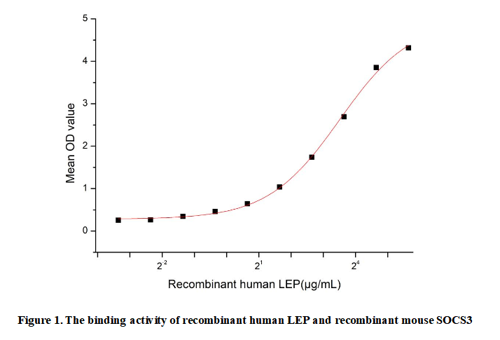 Leptin (LEP) is a 16 kDa adipokine primarily produced by white adipose tissue. Encoded by the LEP gene, it circulates in the bloodstream and acts as a key regulator of energy homeostasis.Leptin signals through the leptin receptor (LEPR), with the long isoform (LEPRb) being crucial for mediating its effects. The hormone travels to the brain, particularly the hypothalamus, where it inhibits appetite and increases energy expenditure, creating a negative feedback loop between fat stores and the central nervous system.Beyond energy regulation, leptin influences reproduction, immune function, and bone metabolism. Its discovery revolutionized the understanding of obesity, revealing the role of hormonal communication between the body's periphery and the brain.Besides,Suppressors Of Cytokine Signaling 3 (SOCS3) has been identified as an interactor of LEP, thus a functional binding ELISA assay was conducted to detect the interaction of recombinant human LEP and recombinant mouse SOCS3. Briefly, LEP was diluted serially in PBS with 0.01% BSA (pH 7.4). Duplicate samples of 100 μl were then transferred to SOCS3-coated microtiter wells and incubated for 1h at 37℃. Wells were washed with PBST and incubated for 1h with anti-LEP pAb, then aspirated and washed 3 times. After incubation with HRP labelled secondary antibody for 1h at 37℃, wells were aspirated and washed 5 times. With the addition of substrate solution, wells were incubated 15-25 minutes at 37℃. Finally, add 50 µL stop solution to the wells and read at 450/630nm immediately. The binding activity of recombinant human LEP and recombinant mouse SOCS3was shown in Figure 1, and this effect was in a dose dependent manner.