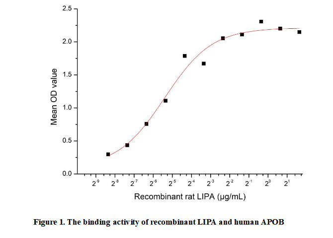 Lysosomal Acid Lipase (LIPA) is a crucial enzyme within the lysosomes that hydrolyzes cholesteryl esters and triglycerides into free cholesterol and free fatty acids. This process is vital for cellular lipid metabolism and energy homeostasis. Deficiencies in LIPA activity lead to severe lipid storage disorders, such as Wolman disease and Cholesteryl Ester Storage Disease (CESD), characterized by the massive accumulation of lipids in the liver, spleen, and other organs. Regarding its interaction, LIPA does not directly bind to Apolipoprotein B (APOB); instead, it interacts with and degrades the lipid core of Low-Density Lipoprotein (LDL) particles, of which APOB is the primary structural protein component.Besides,APOB has been identified as an interactor of LIPA, thus a functional binding ELISA assay was conducted to detect the interaction of recombinant rat LIPA and recombinant pig APOB. Briefly, LIPA was diluted serially in PBS with 0.01% BSA (pH 7.4). Duplicate samples of 100 μl were then transferred to APOB-coated microtiter wells and incubated for 1h at 37℃. Wells were washed with PBST and incubated for 1h with anti-LIPA pAb, then aspirated and washed 3 times. After incubation with HRP labelled secondary antibody for 1h at 37℃, wells were aspirated and washed 5 times. With the addition of substrate solution, wells were incubated 15-25 minutes at 37℃. Finally, add 50 µL stop solution to the wells and read at 450/630nm immediately. The binding activity of recombinant rat LIPA and recombinant pig APOB was shown in Figure 1, the EC50 for this effect is 1.06326µg/mL.