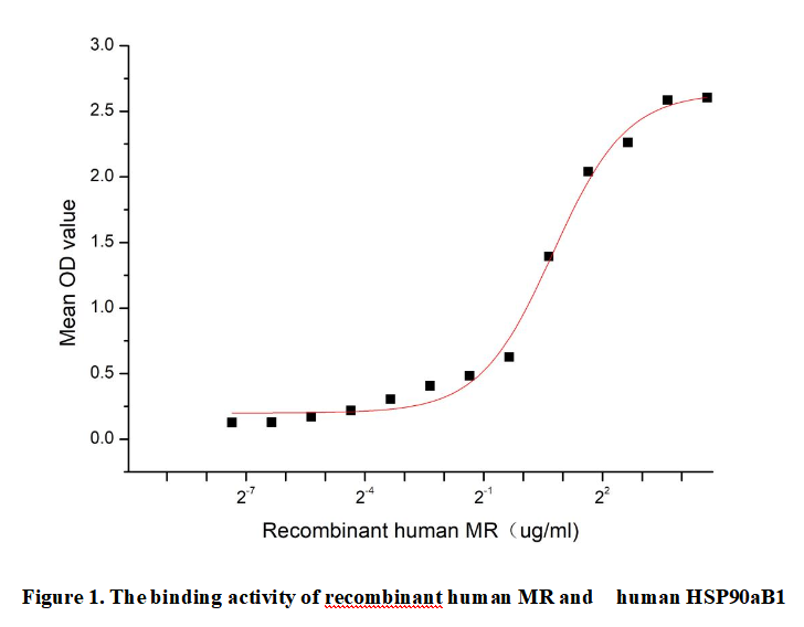 The Mineralocorticoid Receptor (MR) is a ligand-activated transcription factor that mediates aldosterone signaling, regulating electrolyte balance and blood pressure in the kidney. Beyond its classical role, MR influences inflammation, fibrosis, and cardiovascular pathophysiology. As a member of the nuclear receptor superfamily, MR requires chaperone proteins for proper folding and function. Heat Shock Protein 90kDa Alpha B1 (HSP90aB1) is a molecular chaperone that stabilizes MR in its inactive state, facilitating hormone binding and nuclear translocation upon activation. Thus a functional ELISA assay was conducted to detect the interaction of recombinant human MR and recombinant human HSP90aB1. Briefly, MR was diluted serially in PBS with 0.01% BSA (pH 7.4). Duplicate samples of 100 μl were then transferred to HSP90aB1-coated microtiter wells and incubated for 1h at 37℃. Wells were washed with PBST and incubated for 1h with anti-MR pAb, then aspirated and washed 3 times. After incubation with HRP labelled secondary antibody for 1h at 37℃, wells were aspirated and washed 5 times. With the addition of substrate solution, wells were incubated 15-25 minutes at 37℃. Finally, add 50 µL stop solution to the wells and read at 450/630nm immediately. The binding activity of recombinant human MR and recombinant human HSP90aB1 was shown in Figure 1, the EC50 for this effect is 1.68 μg/mL.