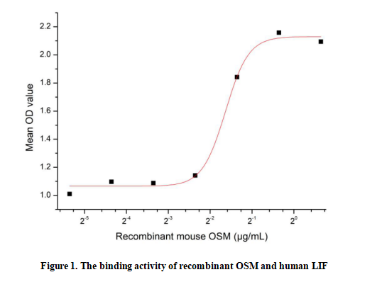 Briefly, OSM was diluted serially in PBS with 0.01% BSA (pH 7.4). Duplicate samples of 100 μl were then transferred to LIF-coated microtiter wells and incubated for 1h at 37℃. Wells were washed with PBST and incubated for 1h with anti-OSM pAb, then aspirated and washed 3 times. After incubation with HRP labelled secondary antibody for 1h at 37℃, wells were aspirated and washed 5 times. With the addition of substrate solution, wells were incubated 15-25 minutes at 37℃. Finally, add 50 µL stop solution to the wells and read at 450/630nm immediately. The binding activity of recombinant mouse OSM and recombinant rat LIF was shown in Figure 1, the EC50 for this effect is 0.322µg/mL.