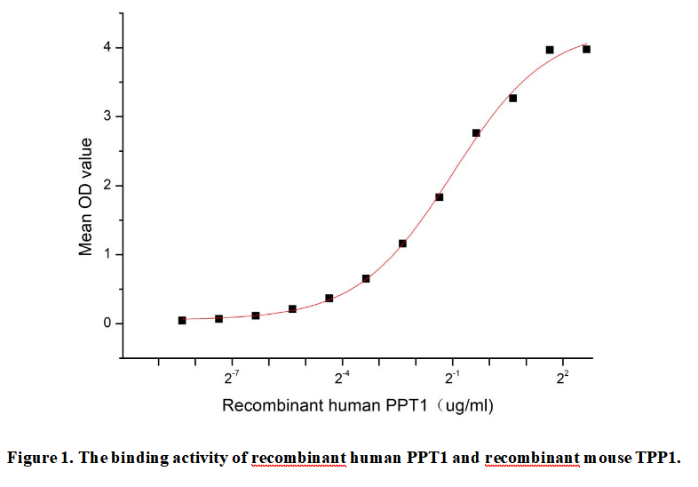 Palmitoyl Protein Thioesterase 1 (PPT1) is a lysosomal enzyme that removes palmitate groups from S-palmitoylated proteins, playing a crucial role in protein degradation and recycling. Mutations in the PPT1 gene cause infantile neuronal ceroid lipofuscinosis (CLN1 disease), a severe neurodegenerative lysosomal storage disorder characterized by vision loss, seizures, and cognitive decline. PPT1's thioesterase activity is essential for breaking down lipid-modified proteins in lysosomes, preventing toxic accumulation. It also influences synaptic function and neuronal survival, linking lipid metabolism to neurodegeneration.Besides,Tripeptidyl Peptidase I (TPP1) has been identified as an interactor of PPT1, thus a functional binding ELISA assay was conducted to detect the interaction of recombinant human PPT1 and recombinant mouse TPP1 . Briefly, biotin-linked PPT1 were diluted serially in PBS, with 0.01% BSA (pH 7.4). Duplicate samples of 100μl were then transferred to TPP1-coated microtiter wells and incubated for 1h at 37℃. Wells were washed with PBST 3 times and incubation with Streptavidin-HRP for 30min, then wells were aspirated and washed 5 times. With the addition of substrate solution, wells were incubated 15-25 minutes at 37℃. Finally, add 50µl stop solution to the wells and read at 450nm immediately. The binding activity of PPT1 and TPP1 was shown in Figure 1, the EC50 for this effect is 0.50 µg/mL.