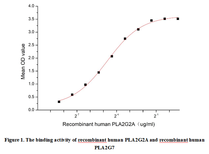 Phospholipase A2, Group IIA (PLA2G2A) is a secreted calcium-dependent enzyme that hydrolyzes phospholipids at the sn-2 position to release arachidonic acid and lysophospholipids, key mediators of inflammation. Primarily expressed in inflammatory cells and various tissues, PLA2G2A plays critical roles in host defense, lipid metabolism, and inflammatory diseases like atherosclerosis and arthritis. Its overexpression is associated with chronic inflammatory conditions and cancer progression. PLA2G2A interacts with Phospholipase A2 Group VII (PLA2G7) by coordinating lipid hydrolysis pathways, where PLA2G7's lipoprotein-associated activity modulates PLA2G2A's pro-inflammatory effects in vascular and immune contexts.Thus a functional binding ELISA assay was conducted to detect the interaction of recombinant human PLA2G2A and recombinant human PLA2G7. Briefly, PLA2G2A was diluted serially in PBS with 0.01% BSA (pH 7.4). Duplicate samples of 100 μl were then transferred to PLA2G7-coated microtiter wells and incubated for 1h at 37℃. Wells were washed with PBST and incubated for 1h with anti-PLA2G2A pAb, then aspirated and washed 3 times. After incubation with HRP labelled secondary antibody for 1h at 37℃, wells were aspirated and washed 5 times. With the addition of substrate solution, wells were incubated 15-25 minutes at 37℃. Finally, add 50 µL stop solution to the wells and read at 450/630nm immediately. The binding activity of recombinant human PLA2G2A and recombinant human PLA2G7 was shown in Figure 1, the EC50 for this effect is 0.038 µg/mL.