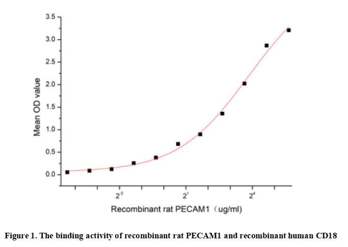 Platelet/Endothelial Cell Adhesion Molecule (PECAM1), also known as CD31, is a transmembrane glycoprotein expressed on endothelial cells, platelets, and leukocytes. It has six immunoglobulin - like domains.PECAM1 maintains vascular integrity via homophilic binding, regulating endothelial cell migration during angiogenesis. It also modulates immune responses by influencing leukocyte movement across the endothelium.Notably, its interaction with Integrin Beta 2 (CD18) promotes leukocyte - endothelial adhesion and transmigration, key for immune cell recruitment to inflammation sites.Thus a functional binding ELISA assay was conducted to detect the interaction of recombinant rat PECAM1 and recombinant human CD18 . Briefly, biotin-linked PECAM1 were diluted serially in PBS, with 0.01% BSA (pH 7.4). Duplicate samples of 100μl were then transferred to CD18-coated microtiter wells and incubated for 1h at 37℃. Wells were washed with PBST 3 times and incubation with Streptavidin-HRP for 30min, then wells were aspirated and washed 5 times. With the addition of substrate solution, wells were incubated 15-25 minutes at 37℃. Finally, add 50µl stop solution to the wells and read at 450nm immediately. The binding activity of PECAM1 and CD18 was shown in Figure 1,and this effect was in a dose dependent manner.