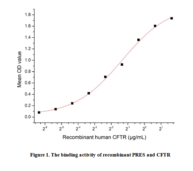 Prestin (PRES), encoded by the SLC26A5 gene, is a key motor protein exclusively expressed in outer hair cells (OHCs) of the mammalian cochlea. It mediates the unique "electromotility" of OHCs—rapid shape changes in response to electrical signals—which amplifies sound vibrations and enhances hearing sensitivity. As a member of the SLC26 anion transporter family, prestin uses voltage-dependent conformational shifts to drive OHC length changes, a process critical for fine-tuning auditory responses. Currently, there is no direct evidence of physical binding between prestin (PRES) and CFTR; their functional interactions in ion homeostasis remain to be clarified.Briefly, CFTR was diluted serially in PBS with 0.01% BSA (pH 7.4). Duplicate samples of 100 μl were then transferred to PRES-coated microtiter wells and incubated for 1h at 37℃. Wells were washed with PBST and incubated for 1h with anti-CFTR pAb, then aspirated and washed 3 times. After incubation with HRP labelled secondary antibody for 1h at 37℃, wells were aspirated and washed 5 times. With the addition of substrate solution, wells were incubated 15-25 minutes at 37℃. Finally, add 50 µL stop solution to the wells and read at 450/630nm immediately.Measured by its binding ability in a functional ELISA. When Recombinant PRES is lmmobilized at 2 µg/mL(100 uLwell), the concentration of CFTR that produces 50% optimal bindingresponse is found to be approximately 0.39287 µg/mL.