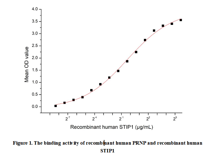 Prion Protein (PRNP) is a membrane-anchored glycoprotein highly expressed in the central nervous system. In its native conformation, this protein participates in important physiological processes including neuronal development, synaptic function, and copper ion binding. The unique aspect of PRNP lies in its ability to undergo conformational changes into a pathogenic form that causes neurodegenerative disorders known as transmissible spongiform encephalopathies.These diseases,which include Creutzfeldt-Jakob disease in humans and mad cow disease in cattle, are characterized by progressive brain damage and sponge-like tissue degeneration. Stress Induced Phosphoprotein 1 (STIP1) binds PRNP through direct physical interaction, modulating PRNP's neuroprotective functions and potentially influencing prion disease pathogenesis.Thus a functional binding ELISA assay was conducted to detect the interaction of recombinant human STIP1 and recombinant human PRNP. Briefly, STIP1 was diluted serially in PBS with 0.01% BSA (pH 7.4). Duplicate samples of 100 μl were then transferred to PRNP-coated microtiter wells and incubated for 1h at 37℃. Wells were washed with PBST and incubated for 1h with anti-STIP1 pAb, then aspirated and washed 3 times. After incubation with HRP labelled secondary antibody for 1h at 37℃, wells were aspirated and washed 5 times. With the addition of substrate solution, wells were incubated 15-25 minutes at 37℃. Finally, add 50 µL stop solution to the wells and read at 450/630nm immediately.Measured by its binding ability in a functional ELISA. When recombinant PRNP is lmmobilized at 2 ug/mL(100 uLwell), the concentration of STIP1 that produces 50% optimal bindingresponse is found to be approximately 0.79ug/mL.