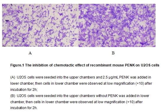 Proenkephalin (PENK) is a protein encoded by the PENK gene. It is initially synthesized as a preproprotein and undergoes proteolytic processing to generate multiple products. As PENK has the function of inhibit the migration cells,we measure the activity of recombinant mouse PENK by the ability of the protein to inhibit the migration of U2OS cells. Thus, chemotaxis assay used 24-well microchemotaxis system was undertaken to detect the inhibition of chemotactic effect of recombinant mouse PENK on U2OS cell line. Briefly, U2OS cells were seeded into the upper chambers and PENK was added in lower chamber with a polycarbonate filter (8 μm pore size) used to separate the two compartments. After incubation at 37℃ with 5% CO2 for 2h, the filter was removed, then cells in low chamber were observed by inverted microscope at low magnification (×10) and the number of migrated cells were counted randomly (five fields for each filter). Result shows MIP-3α is able to induce migration of U2OS cells. The migrated U2OS cells in low chamber at low magnification (×10) were shown in Figure 1.