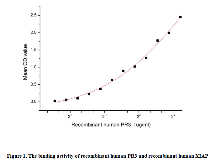 Proteinase 3 (PR3) is a neutrophil-derived serine protease involved in inflammatory and immune responses, as well as the regulation of apoptosis. It contributes to the pathogenesis of autoimmune diseases such as granulomatosis with polyangiitis (GPA), where anti-PR3 autoantibodies (ANCAs) induce neutrophil activation and vasculitis. PR3 modulates immune activity through proteolytic processing of extracellular matrix components and cytokines.Additionally,PR3 cleaves and inactivates XIAP, an anti-apoptotic protein, thereby promoting apoptosis and enhancing cellular sensitivity to death signals. This interaction links inflammation to programmed cell death regulation. Thus a functional ELISA assay was conducted to detect the interaction of recombinant human PR3 and recombinant human XIAP. Briefly, PR3 was diluted serially in PBS with 0.01% BSA (pH 7.4). Duplicate samples of 100 μl were then transferred to XIAP-coated microtiter wells and incubated for 1h at 37℃. Wells were washed with PBST and incubated for 1h with anti-PR3 pAb, then aspirated and washed 3 times. After incubation with HRP labelled secondary antibody for 1h at 37℃, wells were aspirated and washed 5 times. With the addition of substrate solution, wells were incubated 15-25 minutes at 37℃. Finally, add 50 µL stop solution to the wells and read at 450/630nm immediately. The binding activity of recombinant human PR3 and recombinant human XIAP was shown in Figure 1, and this effect was in a dose dependent manner.
