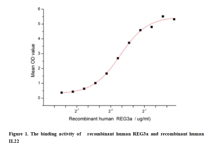 Regenerating Islet Derived Protein 3 Alpha (REG3a),also known as heptocarcinoma-intestine-pancreas (HIP) or pancreatic associated protein (PAP),is a member of to the regenerating protein family.REG3a is expressed in islet beta cells, intestinal tract and pancreatic tissues and plays an important role in mucosal barrier maintenance, innate immunity, tissue regeneration and inflammatory response.Besides,Interleukin 22 (IL22) has been identified as an interactor of REG3a, thus a functional binding ELISA assay was conducted to detect the interaction of recombinant human REG3a and recombinant human IL22. Briefly,REG3a was diluted serially in PBS with 0.01% BSA (pH 7.4). Duplicate samples of 100 μl were then transferred to IL22-coated microtiter wells and incubated for 1h at 37℃. Wells were washed with PBST and incubated for 1h with anti-REG3a pAb, then aspirated and washed 3 times. After incubation with HRP labelled secondary antibody for 1h at 37℃, wells were aspirated and washed 5 times. With the addition of substrate solution, wells were incubated 15-25 minutes at 37℃. Finally, add 50 µL stop solution to the wells and read at 450/630nm immediately. The binding activity of recombinant human REG3a and recombinant human IL22 was shown in Figure 1, the EC50 for this effect is 0.11242ug/mL.