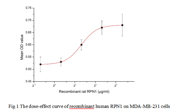 Ribophorin I (RPN1) is a key component of the 19S regulatory particle, which forms part of the 26S proteasome, a large multicatalytic complex responsible for the degradation of ubiquitinated proteins in eukaryotic cells. As a non-ATPase subunit within the regulatory particle, RPN1 plays a critical role in facilitating the recognition, unfolding, and translocation of target proteins into the 20S core particle, where proteolysis occurs. To test the effect of RPN1 on cell proliferation, MDA-MB-231 cells were seeded into triplicate wells of 96-well plates and allowed to attach, replaced with various concentrations of recombinant human RPN1. After incubated for 72h, cells were observed by inverted microscope and cell proliferation was measured by Cell Counting Kit-8 (CCK-8). Briefly, 10 µL of CCK-8 solution was added to each well of the plate, then the absorbance at 450 nm was measured using a microplate reader after incubating the plate for 1-4 hours at 37 ℃. Cell viability was assessed by CCK-8 assay after incubation with recombinant human RPN1 for 72h. The result was shown in Figure 1. It was obvious that RPN1 significantly decreased cell viability of MDA-MB-231 cells. The ED50 of recombinant human RPN1 is 2.5 μg/mL.