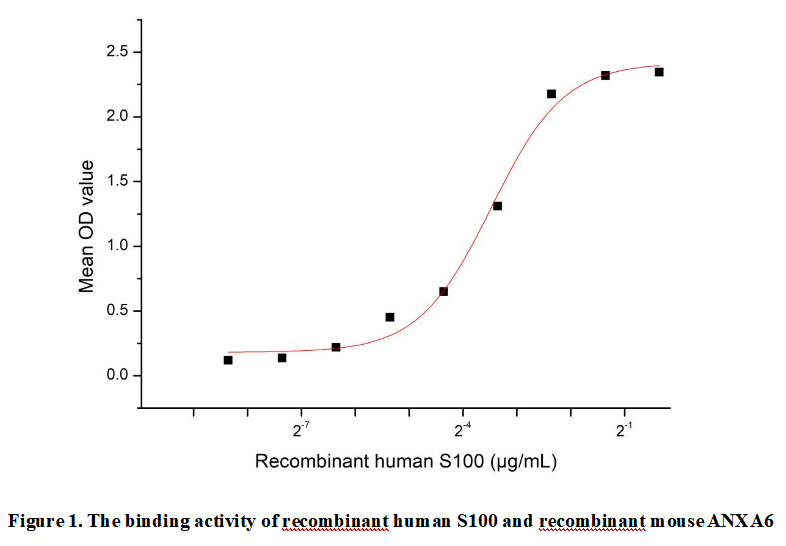 S100 Calcium Binding Protein (S100) is a member of the S100 calcium-binding protein family, primarily expressed in cardiac and skeletal muscle cells. This 10.4 kDa protein plays crucial roles in calcium homeostasis, muscle contraction regulation, and energy metabolism through interactions with target proteins like titin and ryanodine receptors. S100A1's dysregulation is associated with cardiovascular diseases, including heart failure and hypertrophy. S100 directly binds ANXA6 in a calcium-dependent manner, modulating membrane repair processes.Thus a functional binding ELISA assay was conducted to detect the interaction of recombinant human S100 and recombinant mouse ANXA6 .Briefly, biotin-linked S100 were diluted serially in PBS, with 0.01% BSA (pH 7.4). Duplicate samples of 100μl were then transferred to ANXA6-coated microtiter wells and incubated for 1h at 37℃. Wells were washed with PBST 3 times and incubation with Streptavidin-HRP for 30min, then wells were aspirated and washed 5 times. With the addition of substrate solution, wells were incubated 15-25 minutes at 37℃. Finally, add 50µl stop solution to the wells and read at 450nm immediately. The binding activity of recombinant human S100 and recombinant mouse ANXA6 was shown in Figure 1, the EC50 for this effect is 0.09 µg/mL.