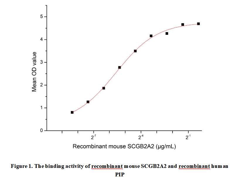 Secretoglobin Family 2A, Member 2 (SCGB2A2) is a 93-amino-acid protein belonging to the secretoglobin superfamily. It is primarily expressed in normal breast and skin tissues and forms a secreted heterodimer with lipophilin B. SCGB2A2 is highly tissue-specific and is overexpressed in 40–80% of human breast cancers, making it a valuable biomarker for breast cancer diagnosis, early metastasis detection, and potential immunotherapy targets. Its low expression in normal mammary epithelium and elevated levels in malignancies highlight its clinical significance. Additionally, SCGB2A2 is conserved across species, including chimpanzees, dogs, and cows, indicating its evolutionary importance.Besides,Prolactin Induced Protein (PIP) has been identified as an interactor of SCGB2A2, thus a functional binding ELISA assay was conducted to detect the interaction of recombinant mouse SCGB2A2 and recombinant human PIP . Briefly, biotin-linked SCGB2A2 were diluted serially in PBS, with 0.01% BSA (pH 7.4). Duplicate samples of 100μl were then transferred to PIP-coated microtiter wells and incubated for 1h at 37℃. Wells were washed with PBST 3 times and incubation with Streptavidin-HRP for 30min, then wells were aspirated and washed 5 times. With the addition of substrate solution, wells were incubated 15-25 minutes at 37℃. Finally, add 50µl stop solution to the wells and read at 450nm immediately. The binding activity of recombinant mouse SCGB2A2 and recombinant human PIP was shown in Figure 1, the EC50 for this effect is 0.021 µg/mL.