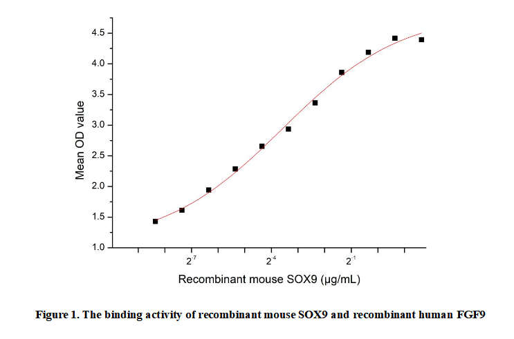 Sex Determining Region Y Box Protein 9 (SOX9) is a transcription factor belonging to the SOX (SRY-related HMG-box) family, which plays crucial roles in embryonic development, cell differentiation, and tissue homeostasis. It is essential for chondrogenesis, male sex determination, and the maintenance of various progenitor cell populations. SOX9 regulates the expression of target genes by binding to specific DNA sequences, influencing pathways such as Wnt/β-catenin and TGF-β.Besides,Fibroblast Growth Factor 9 (FGF9) has been identified as an interactor of SOX9, thus a functional binding ELISA assay was conducted to detect the interaction of recombinant mouse SOX9 and recombinant human FGF9. Briefly, SOX9 was diluted serially in PBS with 0.01% BSA (pH 7.4). Duplicate samples of 100 μl were then transferred to FGF9-coated microtiter wells and incubated for 1h at 37℃. Wells were washed with PBST and incubated for 1h with anti-SOX9 pAb, then aspirated and washed 3 times. After incubation with HRP labelled secondary antibody for 1h at 37℃, wells were aspirated and washed 5 times. With the addition of substrate solution, wells were incubated 15-25 minutes at 37℃. Finally, add 50 µL stop solution to the wells and read at 450/630nm immediately. The binding activity of recombinant mouse SOX9 and recombinant human FGF9 was shown in Figure 1, the EC50 for this effect is 0.08µg/mL.
