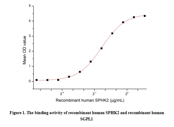Sphingosine Kinase 2 (SPHK2) is an enzyme that phosphorylates sphingosine to produce sphingosine-1-phosphate (S1P), a bioactive lipid mediator involved in cell proliferation, survival, and immune regulation. Unlike its isoform SPHK1, which is primarily cytosolic, SPHK2 localizes to the nucleus, mitochondria, and endoplasmic reticulum, suggesting distinct roles in cellular processes. SPHK2 regulates key pathways such as apoptosis, autophagy, and epigenetic modulation by influencing histone acetylation. It has been implicated in diseases like cancer, neurodegeneration, and metabolic disorders, where its activity can either promote or suppress pathology depending on context.Besides,Sphingosine 1 Phosphate Lyase 1 (SGPL1) has been identified as an interactor of SPHK2, thus a functional binding ELISA assay was conducted to detect the interaction of recombinant human SPHK2 and recombinant human SGPL1. Briefly, SPHK2 was diluted serially in PBS with 0.01% BSA (pH 7.4). Duplicate samples of 100 μl were then transferred to SGPL1-coated microtiter wells and incubated for 1h at 37℃. Wells were washed with PBST and incubated for 1h with anti-SPHK2 pAb, then aspirated and washed 3 times. After incubation with HRP labelled secondary antibody for 1h at 37℃, wells were aspirated and washed 5 times. With the addition of substrate solution, wells were incubated 15-25 minutes at 37℃. Finally, add 50 µL stop solution to the wells and read at 450/630nm immediately. The binding activity of recombinant human SPHK2 and recombinant human SGPL1 was shown in Figure 1, the EC50 for this effect is 0.08µg/mL.