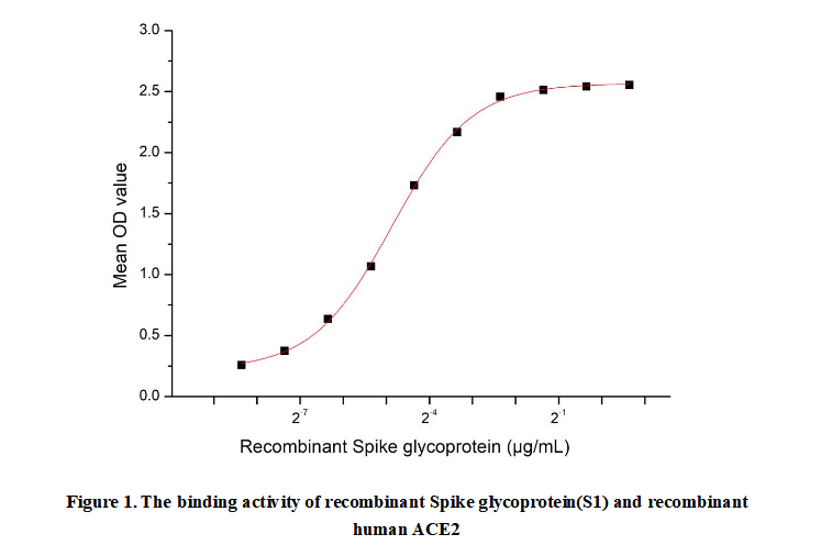 -he endosomes of the host cell induces conformational changes in the S glycoprotein. Thus a binding ELISA assay was conducted to detect the interaction of recombinant human ACE2 and recombinant Spike glycoprotein(S1). Briefly, S1 were diluted serially in PBS, with 0.01% BSA (pH 7.4). Duplicate samples of 100μl were then transferred to ACE2-coated microtiter wells and incubated for 2h at 37℃. Wells were washed with PBST and incubated for 1h with anti-S1 pAb, then aspirated and washed 3 times. After incubation with HRP labelled secondary antibody, wells were aspirated and washed 3 times. With the addition of substrate solution, wells were incubated 15-25 minutes at 37℃. Finally, add 50µl stop solution to the wells and read at 450nm immediately. The binding activity of recombinant Spike glycoprotein(S1) and recombinant human ACE2 was shown in Figure 1, the EC50 for this effect is 0.034µg/mL.