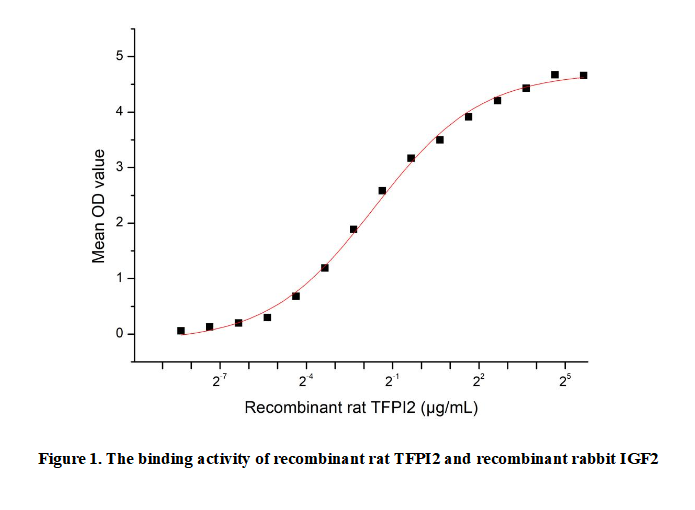 Tissue Factor Pathway Inhibitor 2 (TFPI2) is a serine protease inhibitor primarily produced by endothelial cells, fibroblasts, and placental trophoblasts. It plays a critical role in regulating coagulation by inhibiting the tissue factor (TF)-dependent extrinsic pathway of blood clotting, specifically targeting factor Xa and the TF-factor VIIa complex. Beyond hemostasis, TFPI2 is involved in extracellular matrix remodeling, wound healing, and angiogenesis. It also exhibits tumor-suppressive properties by inhibiting matrix metalloproteinases (MMPs) and preventing tumor invasion and metastasis. Reduced TFPI2 expression is associated with various cancers, including pancreatic, ovarian, and colorectal cancer, making it a potential biomarker for tumor progression. Additionally, TFPI2 has been implicated in cardiovascular and inflammatory diseases.Besides,Insulin Like Growth Factor 2 (IGF2) has been identified as an interactor of TFPI2, thus a functional binding ELISA assay was conducted to detect the interaction of recombinant rat TFPI2 and recombinant rabbit IGF2. Briefly, TFPI2 was diluted serially in PBS with 0.01% BSA (pH 7.4). Duplicate samples of 100 μl were then transferred to IGF2-coated microtiter wells and incubated for 1h at 37℃. Wells were washed with PBST and incubated for 1h with anti-TFPI2 pAb, then aspirated and washed 3 times. After incubation with HRP labelled secondary antibody for 1h at 37℃, wells were aspirated and washed 5 times. With the addition of substrate solution, wells were incubated 15-25 minutes at 37℃. Finally, add 50 µL stop solution to the wells and read at 450/630nm immediately. The binding activity of recombinant rat TFPI2 and recombinant rabbit IGF2 was shown in Figure 1, the EC50 for this effect is 0.32µg/mL.