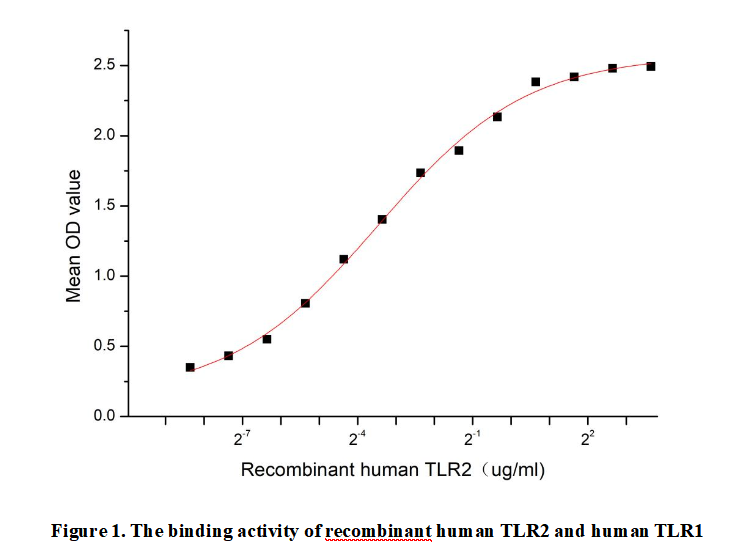 Toll - Like Receptor 2 (TLR2) is a transmembrane protein that plays a crucial role in the innate immune system. It is expressed on the surface of various immune cells, such as macrophages and dendritic cells. TLR2 recognizes a wide range of pathogen - associated molecular patterns (PAMPs), including lipopeptides, peptidoglycans, and lipoteichoic acid from bacteria, as well as components from fungi and viruses. Upon ligand binding, TLR2 initiates a signaling cascade that leads to the activation of transcription factors, such as NF - κB, resulting in the production of pro - inflammatory cytokines and chemokines, which help recruit immune cells to the site of infection and initiate an immune response.TLR2 can form a heterodimer with TLR1, which enhances the recognition of specific PAMPs, expands the range of detectable pathogens, and improves the accuracy and efficiency of the immune response.Thus a functional ELISA assay was conducted to detect the interaction of recombinant human TLR2 and recombinant human TLR1. Briefly, TLR2 was diluted serially in PBS with 0.01% BSA (pH 7.4). Duplicate samples of 100 μl were then transferred to TLR1-coated microtiter wells and incubated for 1h at 37℃. Wells were washed with PBST and incubated for 1h with anti-TLR2 pAb, then aspirated and washed 3 times. After incubation with HRP labelled secondary antibody for 1h at 37℃, wells were aspirated and washed 5 times. With the addition of substrate solution, wells were incubated 15-25 minutes at 37℃. Finally, add 50 µL stop solution to the wells and read at 450/630nm immediately. The binding activity of recombinant human TLR2 and recombinant human TLR1 was shown in Figure 1, the EC50 for this effect is 0.09 μg/mL.