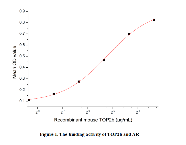 Topoisomerase II Beta (TOP2b) is a nuclear enzyme critical for resolving DNA topological constraints during transcription, replication, and chromatin remodeling. It catalyzes DNA double-strand breakage and religation, regulating genomic stability and gene expression. Expressed ubiquitously, TOP2b is essential for embryonic development and neuronal differentiation, with dysregulation linked to cancer and neurodegenerative diseases. Emerging evidence highlights its role in mediating DNA damage responses and maintaining epigenetic integrity. TOP2b interacts with androgen receptor (AR) to modulate AR-targeted gene transcription in hormone-responsive tissues, facilitating transcriptional activation.To detect the activity of recombinant TOP2b, a functional ELISA assay was performed to evaluate the interaction between recombinant human TOP2b and recombinant human AR.Briefly, biotin-linked TOP2b were diluted serially in PBS, with 0.01% BSA (pH 7.4). Duplicate samples of 100µl were then transferred to AR-coated microtiter wells and incubated for 1h at 37℃. Wells were washed with PBST 3 times and incubation with Streptavidin-HRP for 30min, then wells were aspirated and washed 5 times. With the addition of substrate solution, wells were incubated 15-25 minutes at 37℃. Finally, add 50µl stop solution to the wells and read at 450nm immediately. The binding activity of TOP2b and AR was shown in Figure 1, the EC50 for this effect is 0.0269µg/mL.