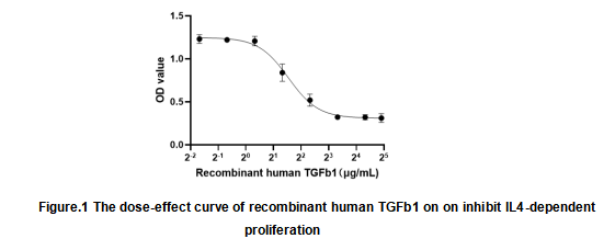 Transforming Growth Factor Beta 1 (TGFB1) belongs to TGF-beta family. As a secreted protein and a cytokine, TGFB plays a role in the formation of blood vessels, the regulation of muscle tissue and body fat development, wound healing, and immune system function. Besides, TGFB1 regulates cell proliferation, differentiation, adhesion, migration by transducing the signal through transmembrane receptors type I and type II (TGFBR1 and TGFBR2). To test the effect of TGFb1 on inhibit IL4-dependent proliferation, CTLL-2 cells were seeded into triplicate wells of 96-well plates, the medium was 2% serum RPMI-1640 including various concentrations of recombinant human TGFb1. After incubated for 72h, cells were observed by inverted microscope and cell proliferation was measured by Cell Counting Kit-8 (CCK-8). Briefly, 10 µl of CCK-8 solution was added to each well of the plate, then the absorbance at 450 nm was measured. Cell viability was assessed by CCK-8 assay. The result was shown in Figure1. It was obvious that TGFB1 significantly decreased cell viability of CTLL-2 cells. The ED50 of recombinant human TGFB1 is 2.91μg/mL.