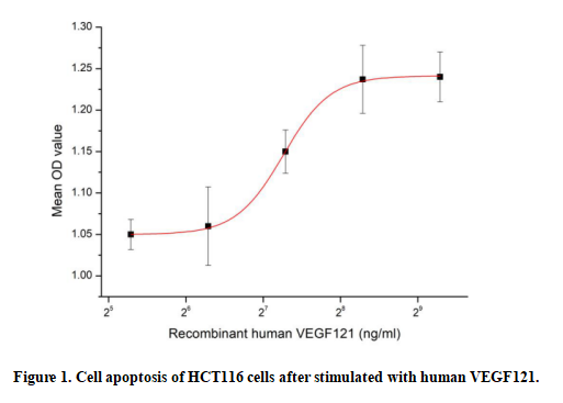 Vascular Endothelial Growth Factor 121 (VEGF121), a secreted glycoprotein member of the VEGF family and a VEGFA splice variant, lacks heparin-binding domains for free extracellular solubility. It binds VEGFR121 on vascular endothelial cells to exert robust pro-angiogenic effects, promoting endothelial cell proliferation, migration and tube formation to drive vasculogenesis and angiogenesis. Distinct from anti-proliferative/pro-apoptotic proteins, it inhibits endothelial cell apoptosis via survival signaling, sustaining vascular integrity and mediating tissue vascularization in development, wound repair and pathological angiogenesis.To test the effect of VEGF121 on cell apoptosis, HCT116 cells were seeded into triplicate wells of 96-well plates at a density of 5,000 cells/well and allowed to attach, replaced with serum-free overnight, then the medium was replaced with 5% serum standard DMEM prior to the addition of various concentrations of recombinant human VEGF121. After incubated for 48h, cells were observed by inverted microscope and cell proliferation was measured by Cell Counting Kit-8 (CCK-8). Briefly, 10 µl of CCK-8 solution was added to each well of the plate, then the absorbance at 450 nm was measured using a microplate reader after incubating the plate for 1-4 hours at 37 ℃. Cell viability was assessed by CCK-8(Cell Counting Kit-8 ) assay after incubation with recombinant VEGF121 for 48h. The result was shown in Figure 1. It was obvious that VEGF121 significantly decreased cell viability of HCT116 cells. The ED50 of recombinant human VEGF121 is 153 ng/mL.
